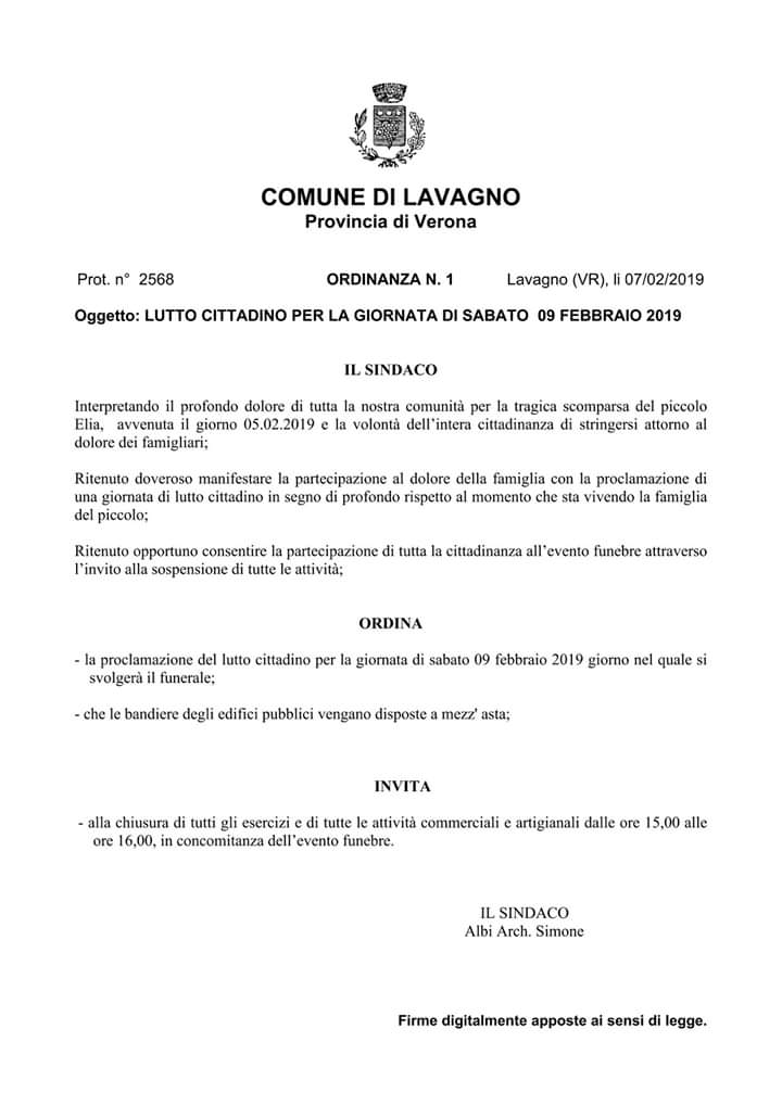 Saranno disposte a mezz’asta le bandiere in tutti gli edifici pubblici e tutta la cittadinanza si stringerà attorno alla famiglia Rizzotti. Il sindaco di Lavagno, Simone Albi, ha proclamato il lutto cittadino per la giornata di sabato: negozi chiusi dalle 15 alle 16 per permettere a tutti di dare l’ultimo saluto nella chiesa di San Pietro di Lavagno, al piccolo calciatore. Arrivato in condizioni già compromesse domenica sera, dopo che era stato colpito da un arresto cardiaco a casa, Elia è spirato la notte di lunedì, nella terapia intensiva pediatrica di Borgo Trento, ancora da chiarire le ragioni del decesso, che saranno dettagliate dall’autopsia.