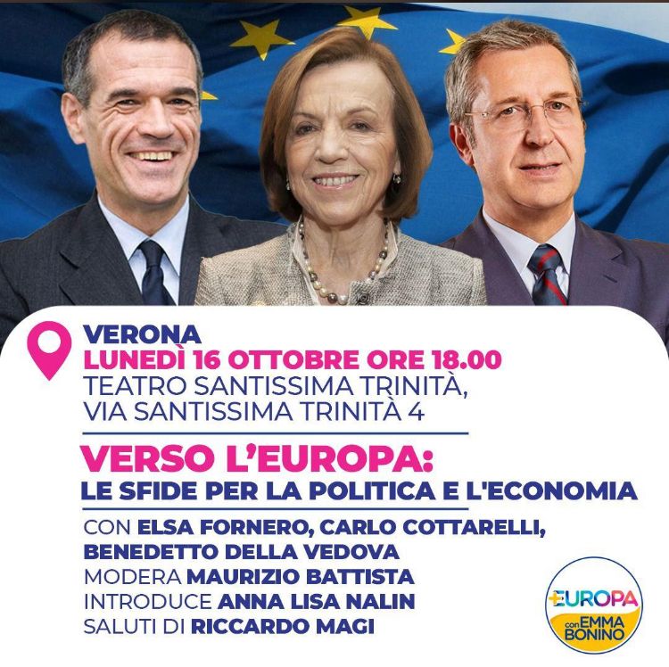 “Verso l’Europa: le sfide per la politica e l’economia”. Questo il titolo del dibattito che si terrà il 16 ottobre dalle ore 18 alle 20 presso il Teatro Santissima Trinità, via Santissima Trinità 4, Verona, e che avrà come relatori l’ex ministro del lavoro e delle politiche sociali Elsa Fornero (promotrice della riforma delle pensioni omonima, Legge 92/2012), l’economista e già direttore del dipartimento Affari Fiscali del Fondo Monetario Internazionale Carlo Cottarelli e il deputato già sottosegretario di Stato al Ministero degli esteri Benedetto Della Vedova. In apertura i saluti del deputato e membro della Commissione Affari Costituzionali Riccardo Magi.