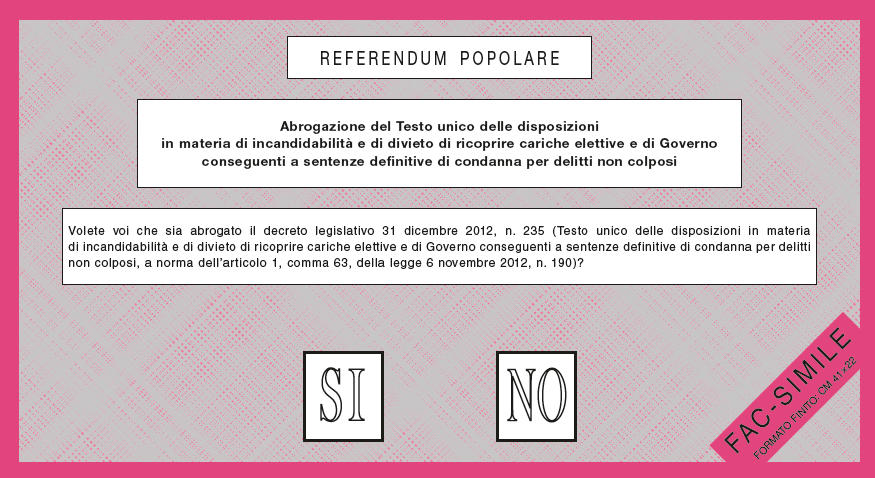 Il primo dei quesiti mira ad abrogare la Legge Severino che prevede l’incandidabilità, l’ineleggibilità e la decadenza automatica per parlamentari, membri del governo, consiglieri regionali, sindaci e amministratori locali nel caso di condanna non definitiva.