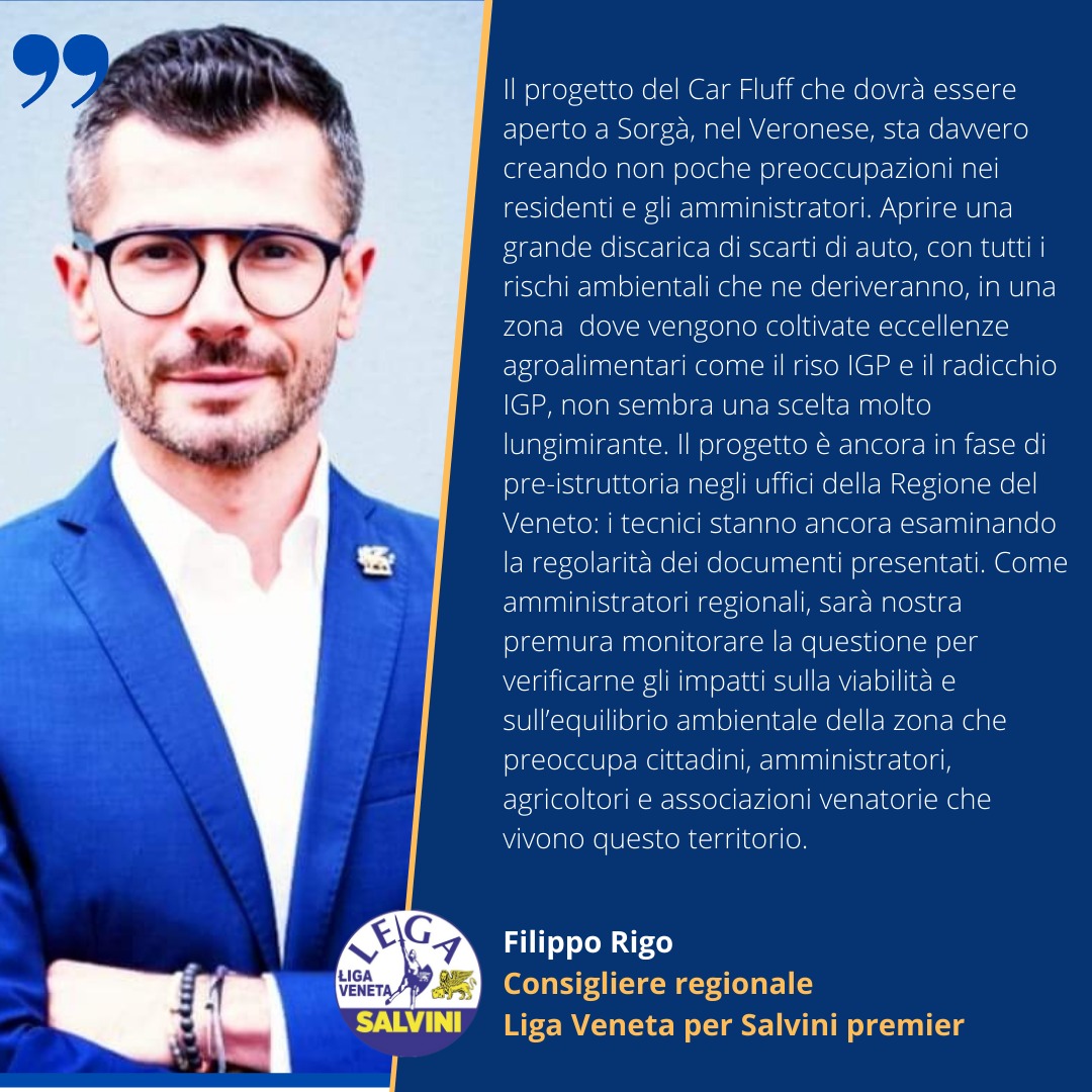 «Il progetto del Car Fluff che dovrà essere aperto a Sorgà, nel Veronese, sta davvero creando non poche preoccupazioni nei residenti e gli amministratori. Aprire una grande discarica di scarti di auto, con tutti i rischi ambientali che ne deriveranno, in una zona a spiccata vocazione agricola, dove vengono coltivate eccellenze agroalimentari come il riso IGP e il radicchio IGP, non sembra una scelta molto lungimirante» così Filippo Rigo, consigliere regionale del Gruppo Liga Veneta per Salvini Premier, sulla vicenza del Car Fluff.