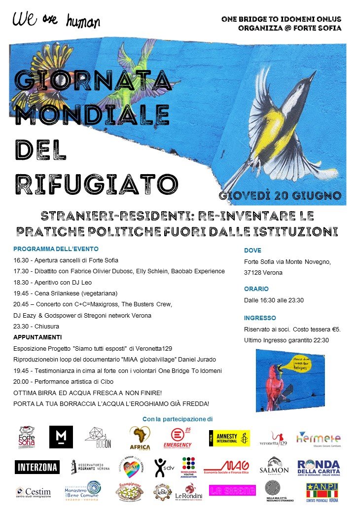 Nella nostra città la Giornata Mondiale del Rifugiato si svolgerà al Forte Sofia giovedì, a partire dalle 16.30. Una giornata propositiva fatta di dibattiti e confronti sulla possibilità, ma anche sulla crescente volontà dei cittadini, di riappropriarsi del proprio impegno politico. Perchè di esempi virtuosi ce ne sono, e giovedì saranno presenti anche fisicamente per portare la loro esperienza.