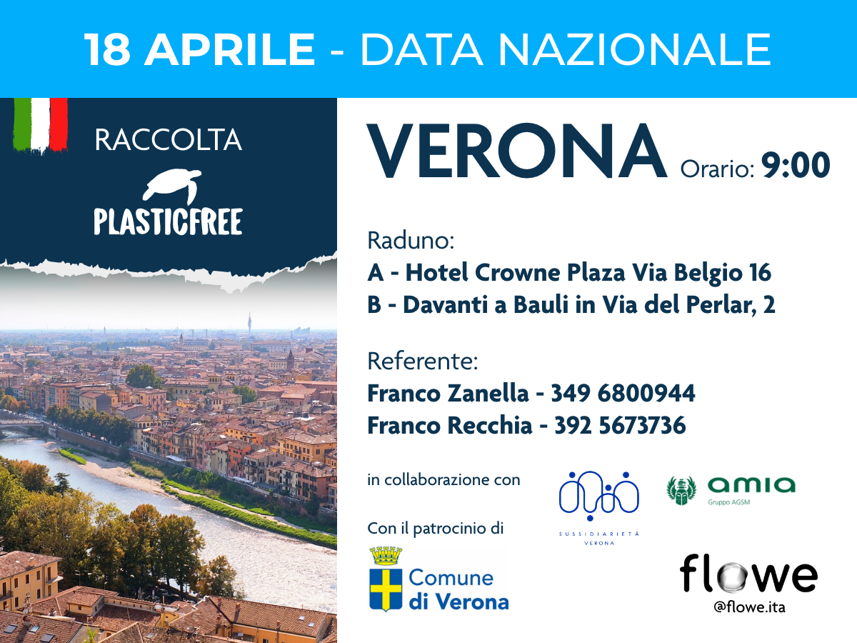 Domenica 18 aprile, anche a Verona si festeggerà la Giornata Nazionale PlasticFree, con iniziative di raccolta rifiuti realizzate in collaborazione tra il Comune e il gruppo veronese di PlasticFree, costola dell’omonima associazione nazionale, accomunate dall’intento di mettere fine alla cattiva abitudine di buttare la spazzatura dove capita, anche se a pochi metri di distanza ci sono gli appositi cassonetti.