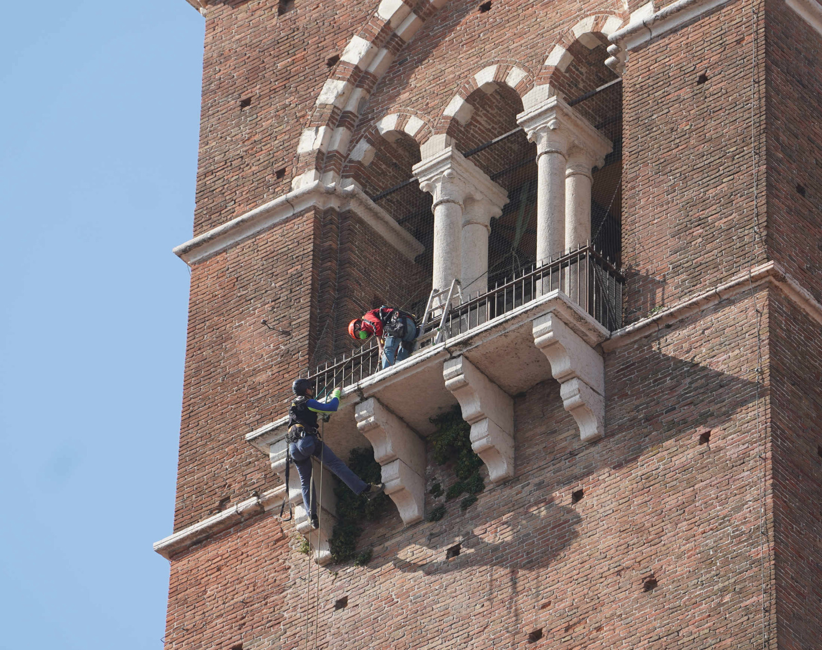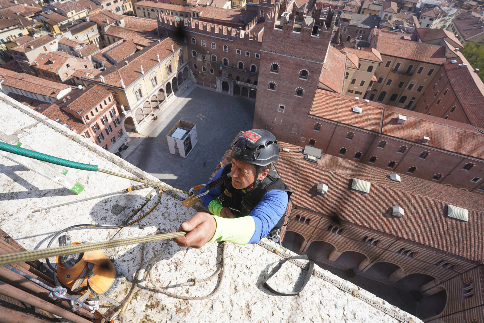 Le verifiche e i rilievi di questa settimana hanno confermato che la Torre dei Lamberti è sicura e che i piccoli frammenti caduti in piazza Erbe una decina di giorni fa provenivano dal tetto del Palazzo della Regione: a differenza della Torre, infatti, l’edificio non si presenta in stato ottimale, come rilevato dal materiale fotografico e dai controlli effettuati dai muratori acrobatici che per tutta la settimana si sono calati su e giù dai tetti del complesso monumentale.