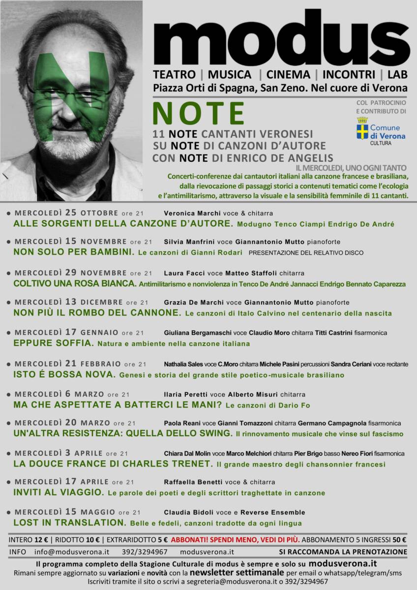 Un progetto che il Teatro Modus, in stretta sinergia con il giornalista Enrico de Angelis, dedica all’universo della canzone d’autore. Da alcuni anni il giornalista de Angelis conduce un’opera di valorizzazione delle risorse musicali di cui il nostro territorio è ricco, soprattutto riguardo al parco di eccellenti voci femminili e di straordinari strumentisti che Verona può vantare.