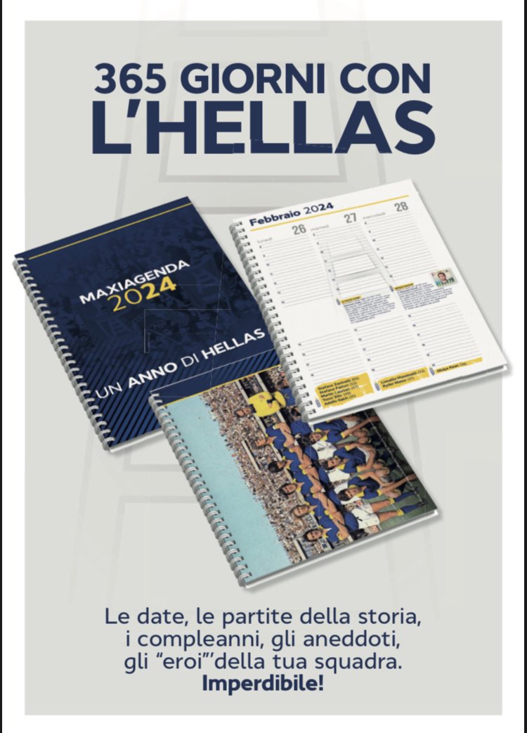 La settimana scorsa è uscita nelle edicole di Verona e provincia, e nelle migliori librerie, la “MAXIAGENDA 2024” dell’Hellas, 365 giorni gialloblù. «Un viaggio nel presente, con i compleanni dei protagonisti, ma soprattutto un viaggio nella storia attraverso gli episodi, gli aneddoti, le partite che hanno segnato un’epoca. spiega l’autore – Inoltre, grande spazio alle statistiche, alle “copertine” storiche e, soprattutto, a 12 poster da ritagliare e conservare. Insomma, non soltanto un’agenda, ma una sorta di “ripasso” della lunga storia dell’Hellas».