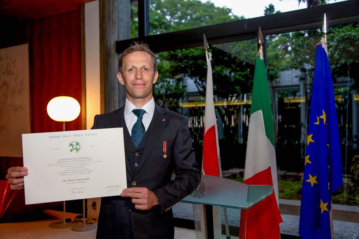 Nel 2016, inoltre, grazie alla sua solidarietà nei confronti del Giappone terremotato, Ronnie Quintarelli è stato nominato all’ambasciata di Tokyo “Ufficiale dell’Ordine della Stella d’Italia”. L’onorificenza, conferita dal Presidente Della Repubblica Sergio Mattarella, era stata consegnata al pilota di casa Nissan dall’allora Ambasciatore italiano in Giappone Domenico Giorgi.
